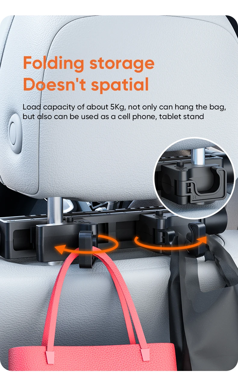 Diseño plegable que ahorra espacio con una capacidad de carga de 5 kg.Úselo como un práctico gancho para bolso o como soporte estable para teléfono/tableta.