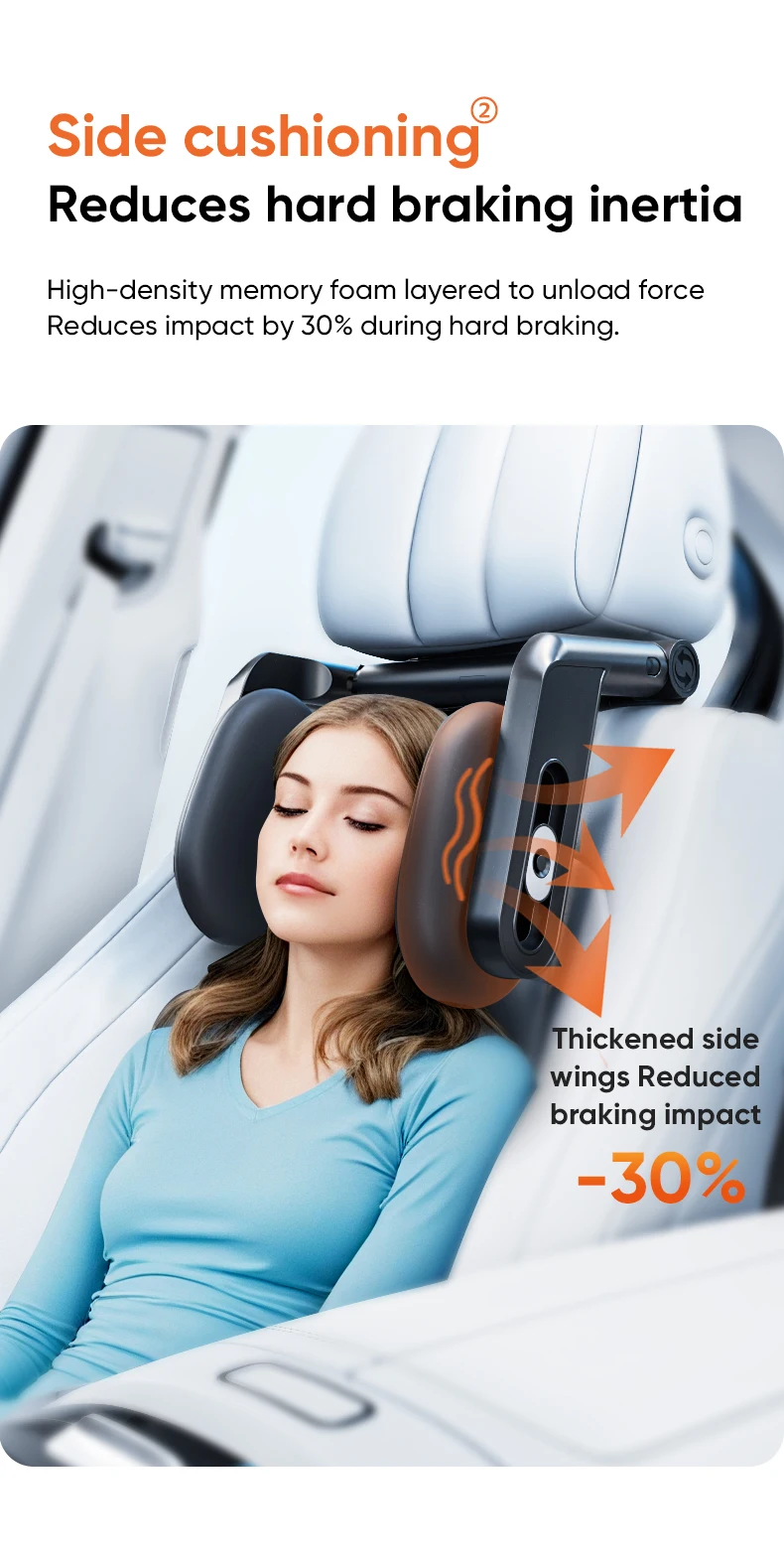 Las alas laterales engrosadas con capas de espuma viscoelástica de alta densidad absorben los golpes y reducen la inercia por un frenado brusco, disminuyendo el impacto en un 30%.